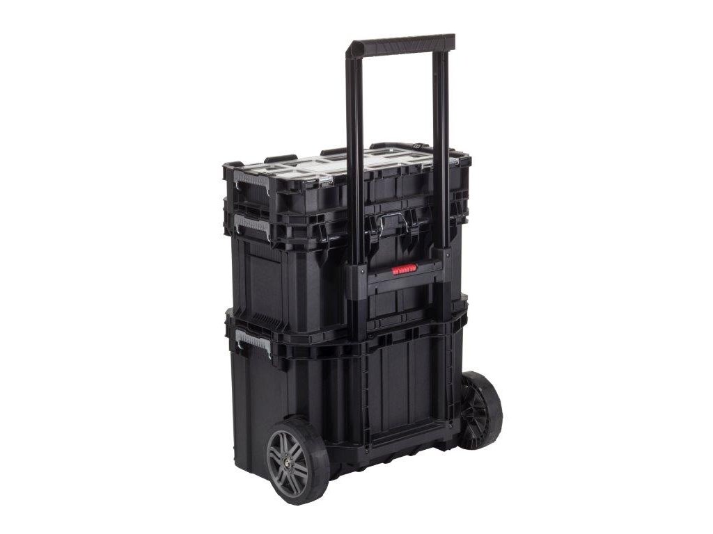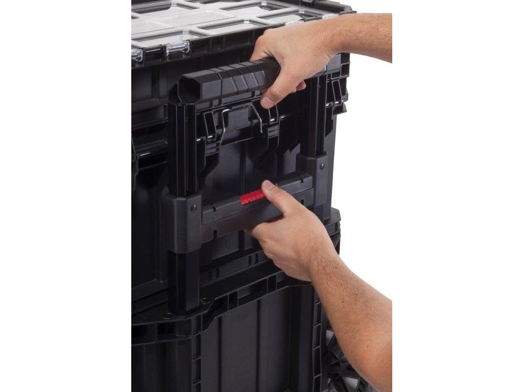 Box na nářadí s organizérem, teleskopickým madlem a gumovými kolečky. Snadná manipulace, odolné kovové západky, bezpečné uzavření.