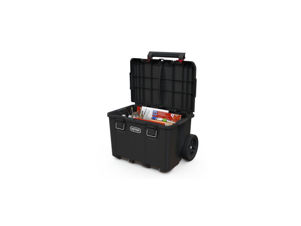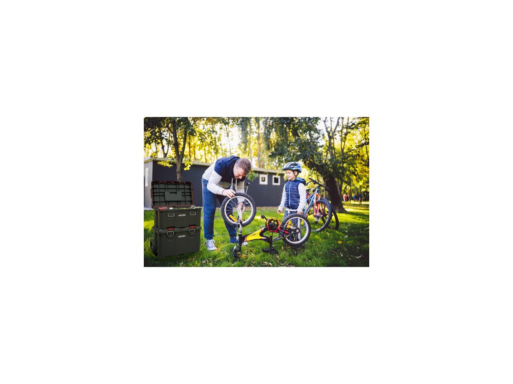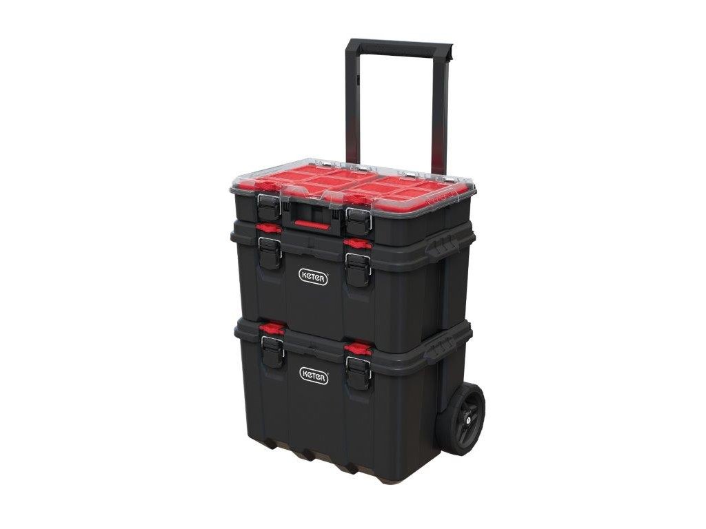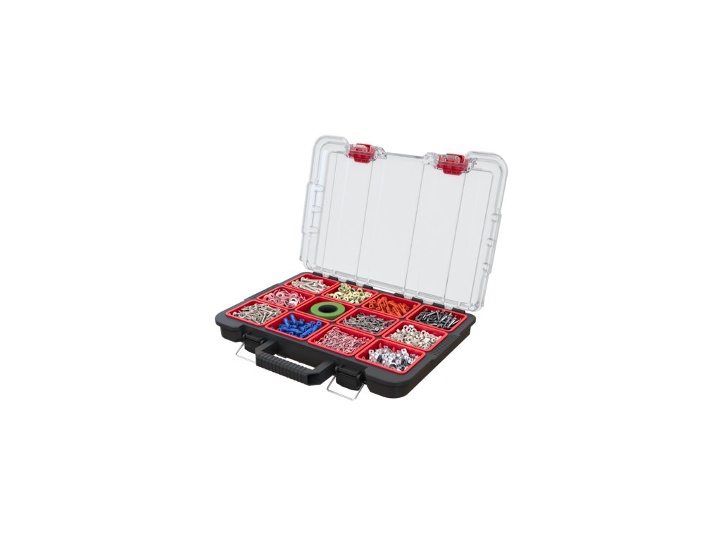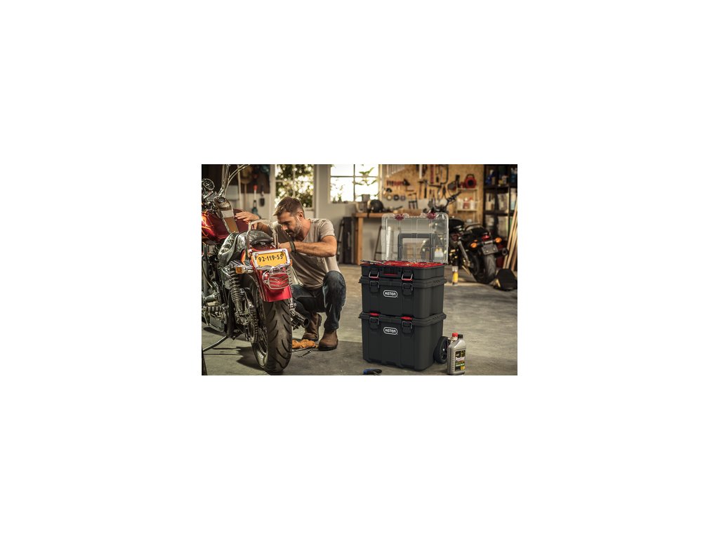 Využijte mobilní systém s organizérem a vyjímatelnými boxy a uspořádejte do nich kromě velkého náčiní také šroubky, matice, vruty a další drobné pomůcky. Kovové západky zajistí pevné uzavření víka. Obsah boxů se vám tedy nevysype a zůstane v bezpečí. Teleskopické kovové madlo vám navíc zjednoduší manipulaci celého systému.