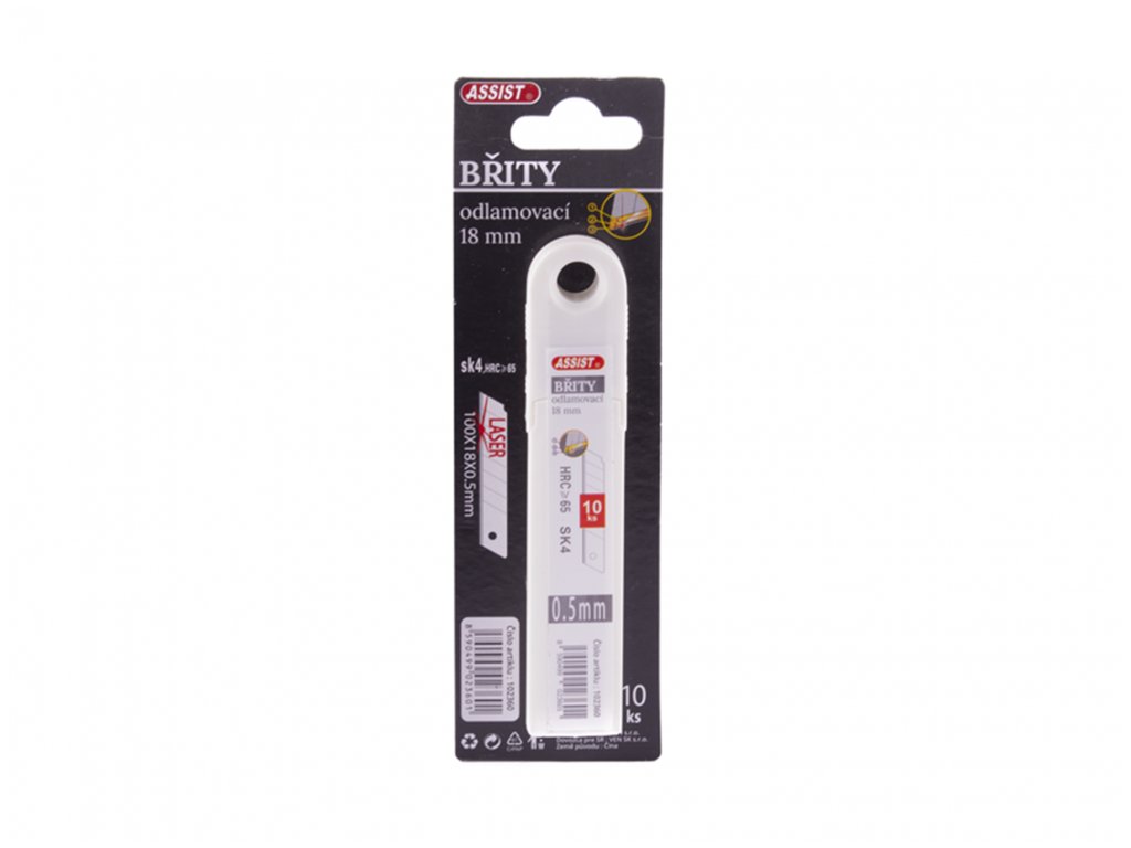 Břity odlamovací ASSIST SK4 využijete k řezání měkčích materiálů (papír, fólie, kartony) a zároveň na středně odolné materiály (sádrokarton, linoleum, tenčí koberce). Velkou výhodou je, že čepele jsou uložené ve výklopném pouzdře ze kterého se snadno vysouvají. Břity jsou broušeny laserovou technologií a vyrobeny z ocele SK4 s tvrdostí HRC > 65. Rozměr břitu je 100 x 18 mm, tloušťka 0,5 mm. Balení obsahuje 10 kusů.