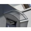 Vchodová stříška Calisto z hliníkové práškově lakované konstrukce s odolnými podpěrami z vysoce nárazuvzdorného polymeru a UV odolné dvoukomůrkové polykarbonátové desky o tloušťce 10 mm.