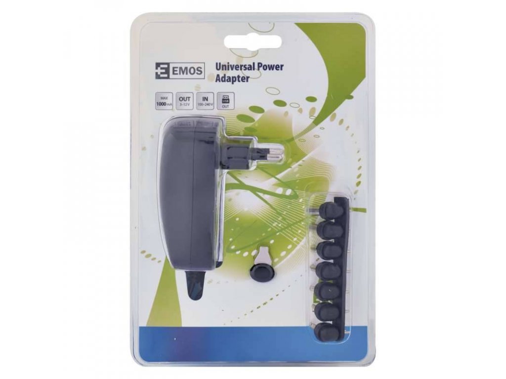 U univerzálního pulzního napájecího zdroje Emos můžete vybírat ze 7 možností nastavení výstupního napětí od 3 V do 12 V. Sada obsahuje konektory B 3,5/15; C 3,0×1,0/10; D 5,0×2,1/12; G 5,5×2,5/10; H 3,5×1,35/10; I 4×1,7/10; S 2,35×0,75/8,7. Napájecí zdroj, který disponuje USB výstupem (5 V; 2,0 A), je vhodný pro zařízení s odběrem až 1500 mA. Kabel má délku 1,5 m.