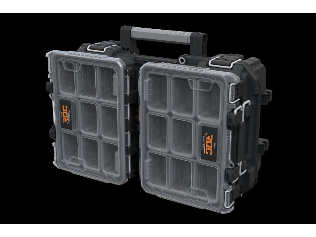 Udělejte si pořádek v dílně s organizérem ROC Pro Gear 2.0 . Skládá se z 6 vyjímatelných přihrádek ve světle šedé barvě a 1 většího boxu, který můžete zmenšit pomocí 2 přepážek. Uložíte do nich spojovací materiál a další drobné pomůcky. Organizér uzavřete pomocí průhledného víka. Díky němu máte přehled o jeho obsahu. Organizér navíc odolá nárazům. Jelikož má poloviční velikost oproti klasickému organizéru z této řady, bez obav uchytíte v modulárním systému Pro Gear dva tyto organizéry vedle sebe.