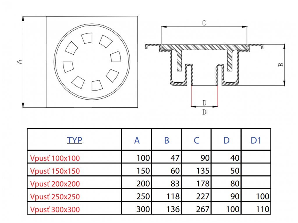 Podlahová vpusť s přímým odtokem a plastovou mřížkou