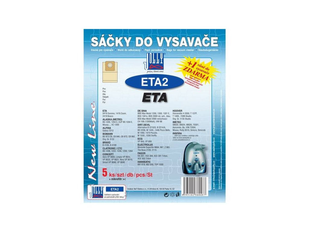 Potřebujete nový sáček do vysavače? Pak jsou sáčky do vysavače Sáčky do vysavače ETA2 správnou volbou. Pro výrobu těchto sáčku byl použit papír. V sadě najdete 5 sáčků Jolly. V balení je také mikrofiltr, proto mohou zachytit i drobné částice. Tyto sáčky do vysavače se používají jednorázově.
