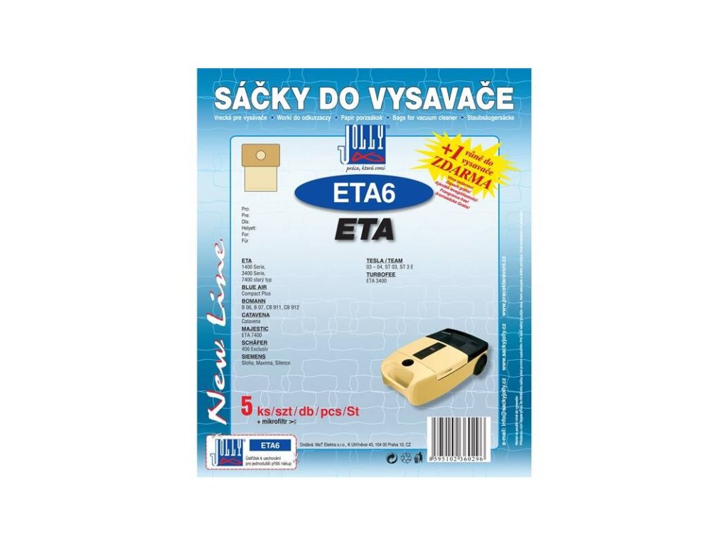 Hledáte sáčky do vysavače? Potom pro vás budou sáčky do vysavače Sáčky do vysavače ETA6 správnou volbou. Materiálem použitým na výrobu těchto sáčků je papír. Sada čítá 5 sáčků Jolly. Součástí balení je také mikrofiltr, ten zajistí zachycení drobných částic. Tyto sáčky jsou určené pro jednorázové použití.