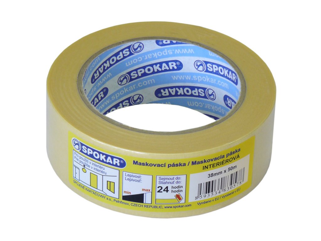 SPOKAR Maskovací páska interiérová je tenký mírně krepový papír s mírnou lepivostí, který slouží k vytváření velmi přesných okrajů při malování. Je ideální pro vnitřní použití při výmalbě. Maximální doba nalepení je 24 hodin a páska je určena pro práci do 60 °C.