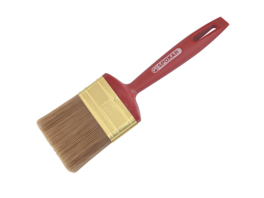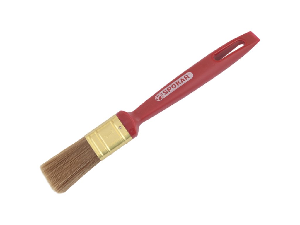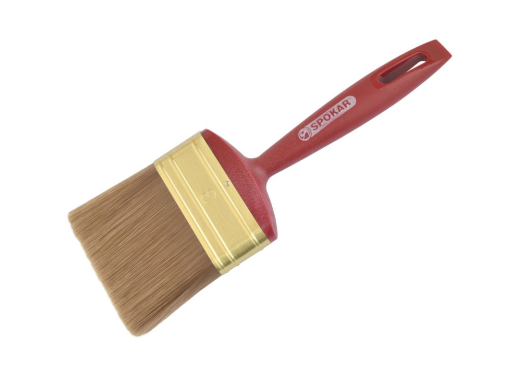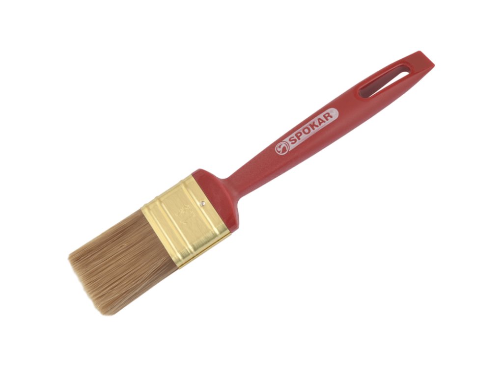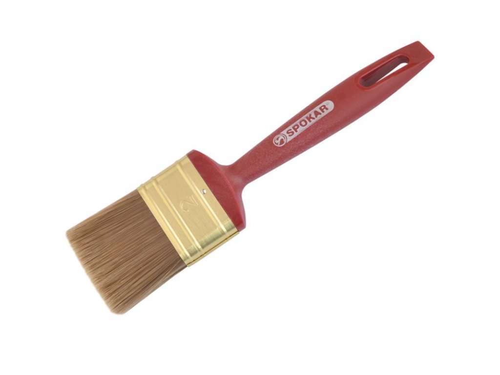 SPOKAR Štětec plochý 81267 EVO je univerzální štětec vhodný pro všechny druhy nátěrových hmot. Štětec je dodáván v různých šířkách, tloušťkách a délkách vláken. Štětec disponuje syntetickými vlákny EVO, která jsou kónická v celé délce a mají velmi jemně rozštěpené konce. Díky kónickému tvaru vláken výborně saje barvu a zajišťuje její perfektní rozetření do tenké rovnoměrné kompaktní vrstvy. Plastové držadlo je pootočené vůči hlavě štětce pro lepší uchopení a jeho zakončení je ve formě špachtle - stěrky.