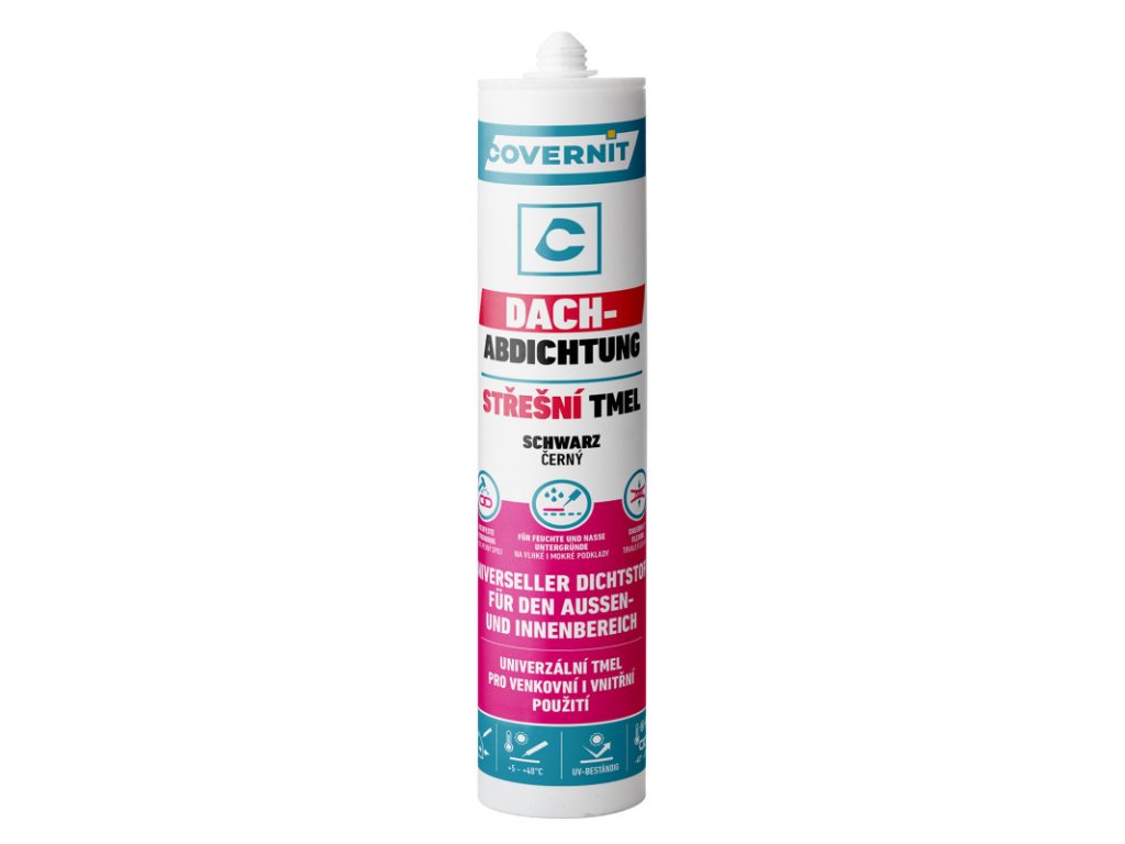 Covernit Střešní bitumenový tmel je vysoce eleastické bitumenové lepidlo a tmel v husté pastě. Slouží především k utěsnění a lepení střešních šindelů, prostupů, světlíků a dalších detailů, vhodný je ale i ke spojování překrývajících se částí bitu-polymerních membrán za studena. Disponuje vysokou odolností vůči UV záření. Spotřeba je cca 1 ks/10 m2 střechy.