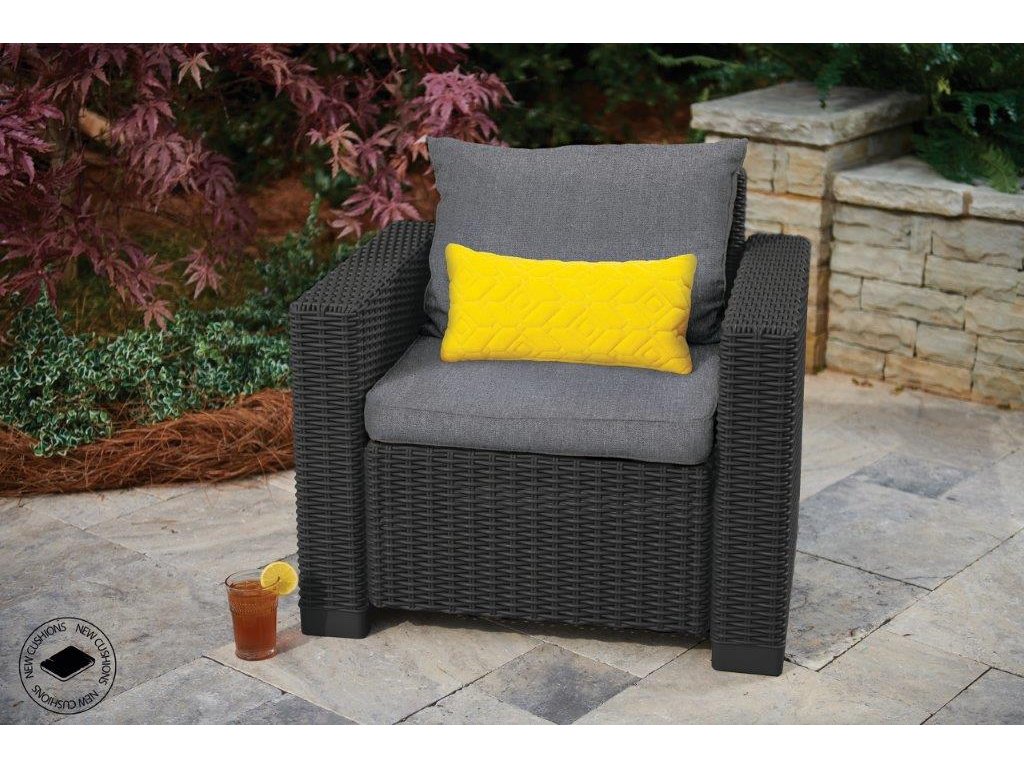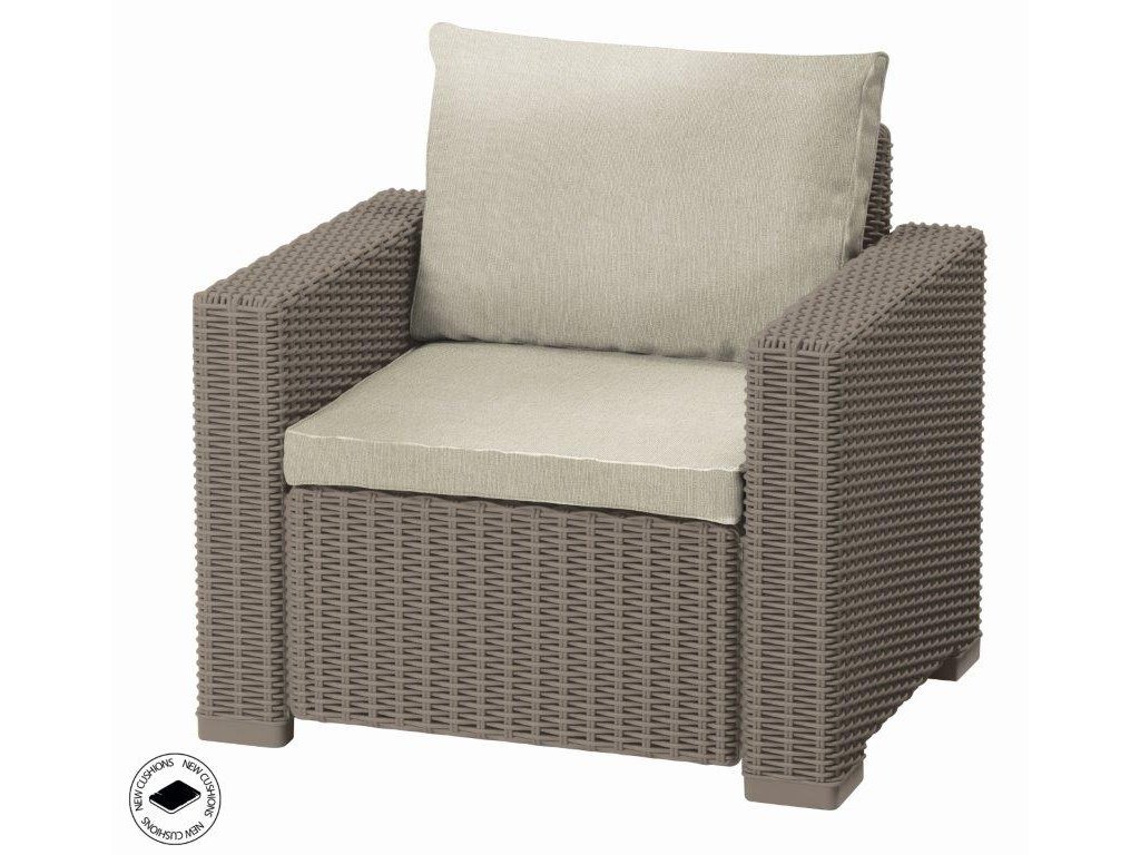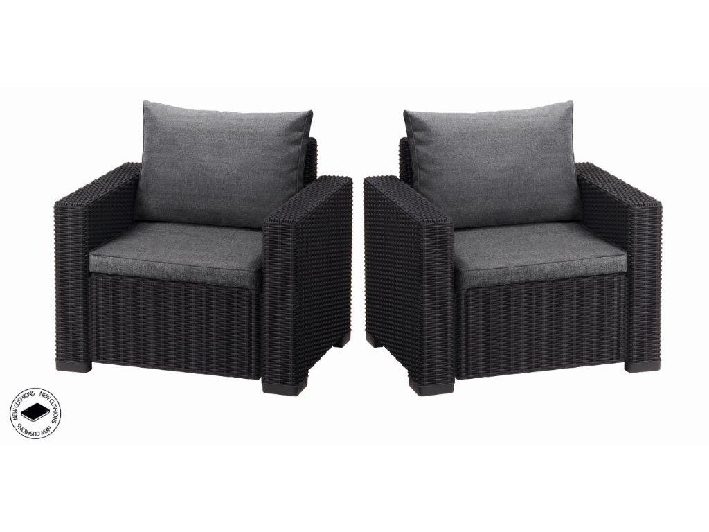 2 kusy zahradních křesel California vás nadchnou svým nevšedním designem v imitaci přírodního ratanu. Konstrukce je přitom pevná a vydrží běžné zatížení venkovního provozu.